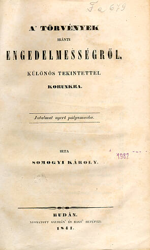A mûvet így ajánlja: „...a’ tudós szerzõ ... munkáját fõleg az ifiúság tanitóinak figyelmébe bátorkodunk ajánlani, mint ollyast, melly különösen képes mind velõs, mind kellemetes irásmódja a’ világos és logicai rend, ’s ritka tudományos készület által az ifiaknak a’ haza reményének ’s jövendõ polgárinak szivébe a’ törvények iránti engedelmességet jó eleve becsepegtetni..." |